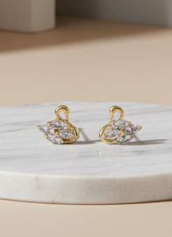 - Formato de cisne com corpo cravejado em zircônias de corte navete e detalhe de esfera dourada central.