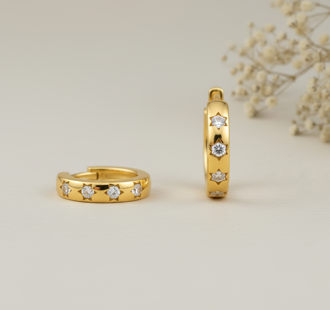 - Argola compacta com fileira de cristais integrados, refletindo luz em movimento contínuo e elegância minimalista.
